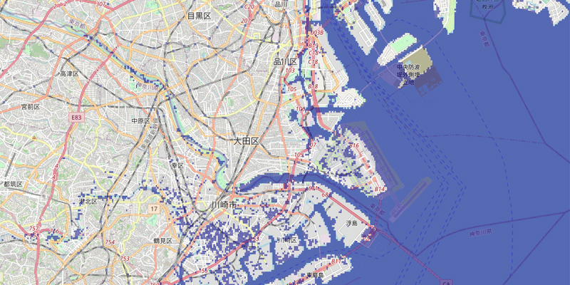 「海抜」つながりで心配されるのが、海面の上昇。地球の温暖化対策を取らなかった場合、21世紀末の地球の平均海面水位は、最大82センチも上昇する可能性が高いと予測されています(※1)。実際、どんな風に浸水するかが分かるマップを発見!(Flood Maps http://flood.firetree.net/)海抜を今より●●メートル高くなると設定して、世界中の海面上昇による浸水を確認することができます。ちなみに海面水位が59センチ上昇したとすると、日本の三大湾(東京湾、大阪湾、伊勢湾)のゼロメートル地帯の面積は、5割増すと予測されているデータも(※2)。このアプリではメートル単位でしか設定できないので、1メートル上昇で設定してみると、上の図のような結果に!かなりの地域が浸水してしまうことがわかります。美しい砂浜なんてなくなってしまう勢いです。地球温暖化、やばいです。世界中の地域を簡単に確認できるのでぜひ試して危機を実感してみて欲しいです。